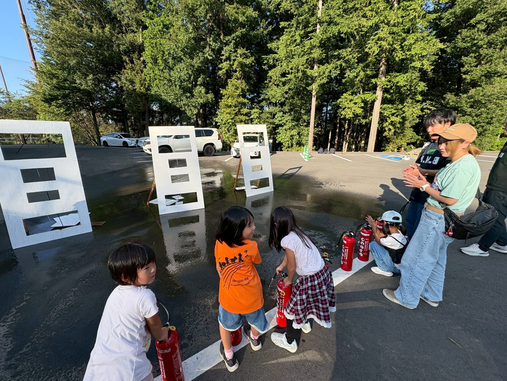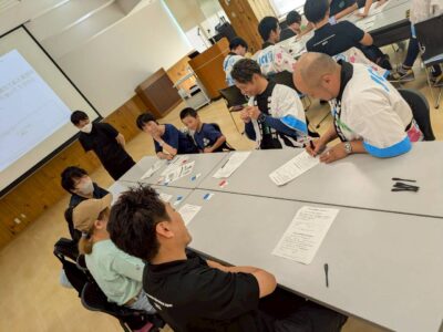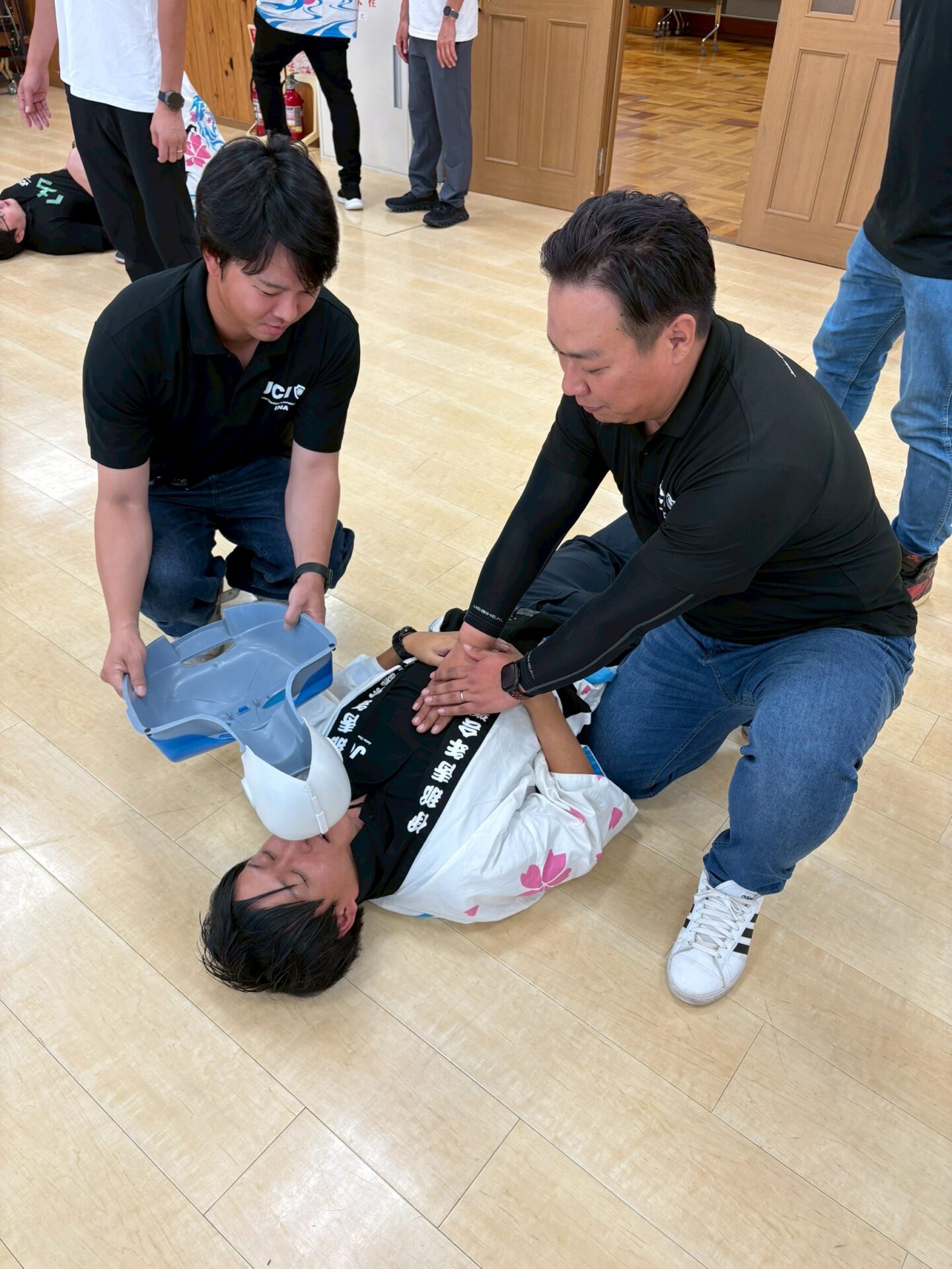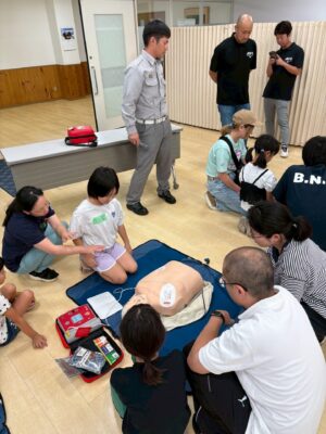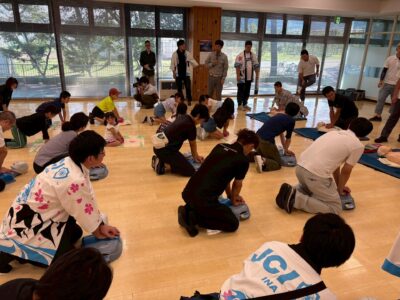 午後の部は、参加者とJCメンバーで協力して、防災ミッションにチャレンジしてもらいました。担架搬送、土嚢作り、水消化器体験、防災クイズ、また救急講習による心配蘇生と、1人ではできない体験により、つながりを深め、また防災を楽しく学べる機会となりました。